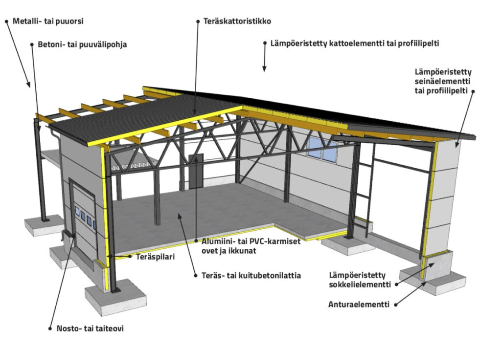 Kotimainen elementtihalli, teollisuushallit, liike-, tuotanto- ja vapaa-ajantilat